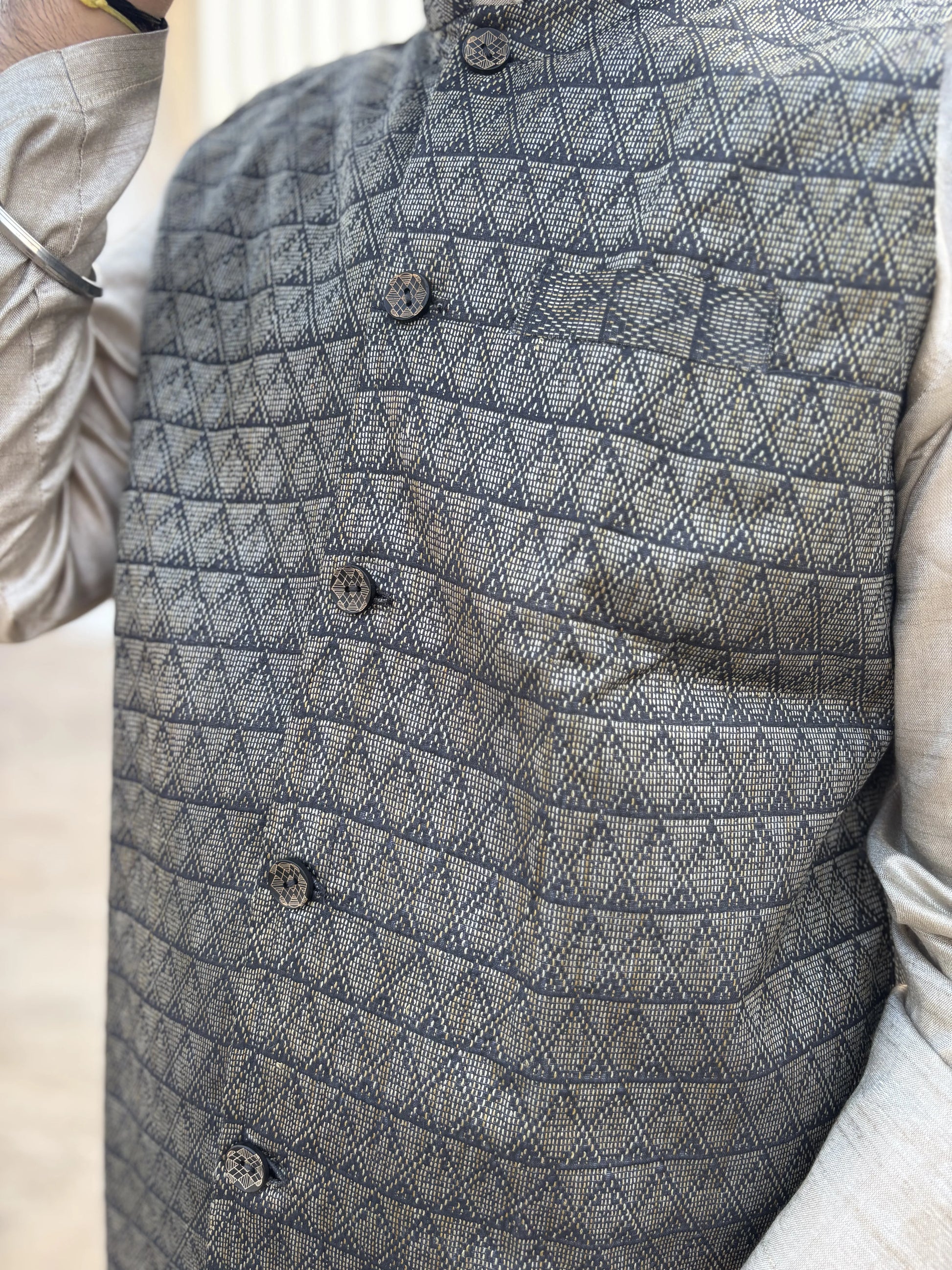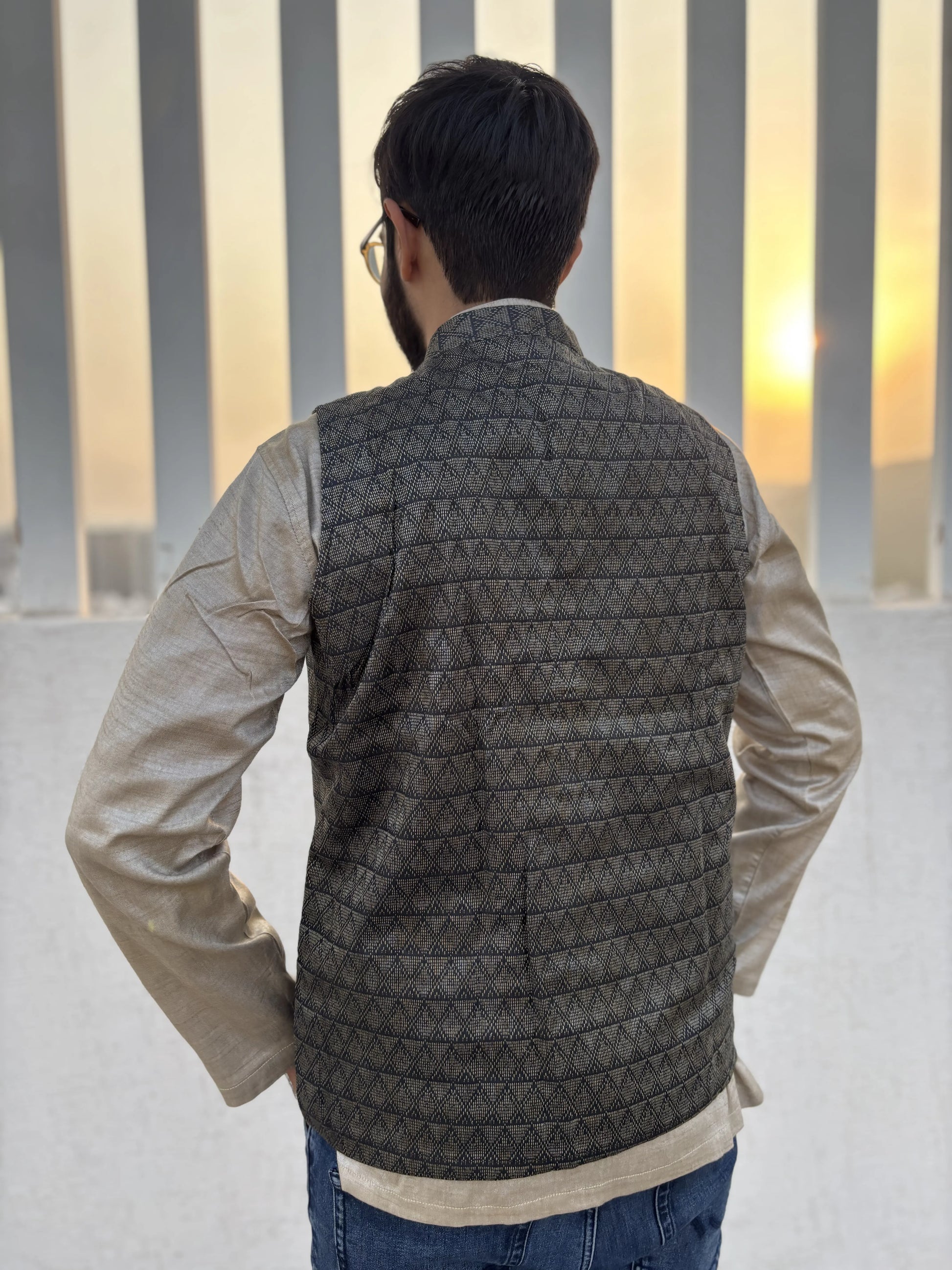 Add timeless charm to your wardrobe with Aasmaan’s black waistcoat for men, crafted from lightweight and breathable Bhagalpuri cotton. This versatile piece features a clean-cut silhouette and wooden buttons, adding an earthy, artisanal accent to your look. Pair it with a kurta for traditional occasions or layer over a shirt and trousers for a refined, contemporary outfit. We’ve styled it with our light gold solid Bhagalpuri short kurta for a festive yet understated ensemble—perfect for celebrations, cultural events, or wedding functions.