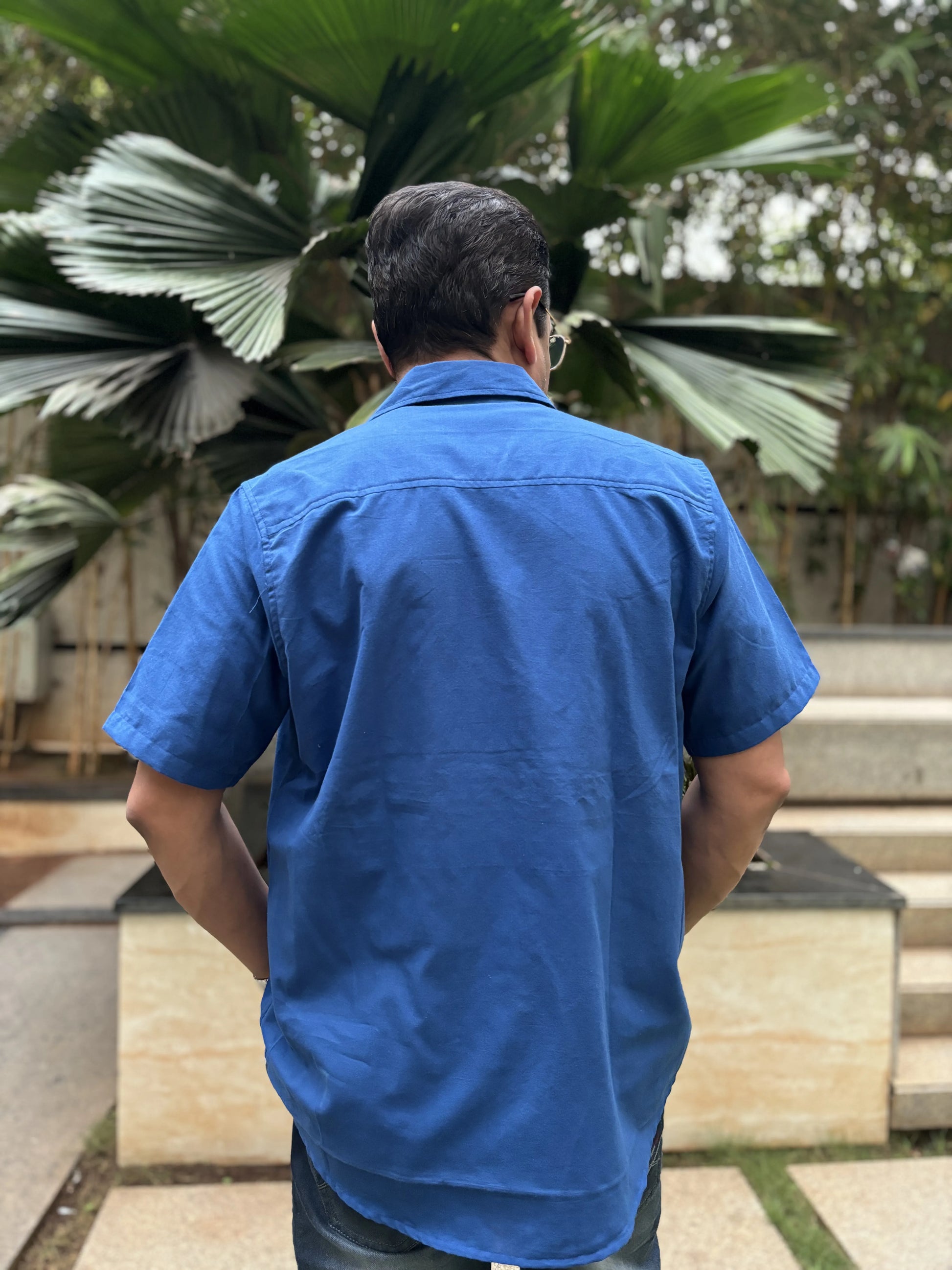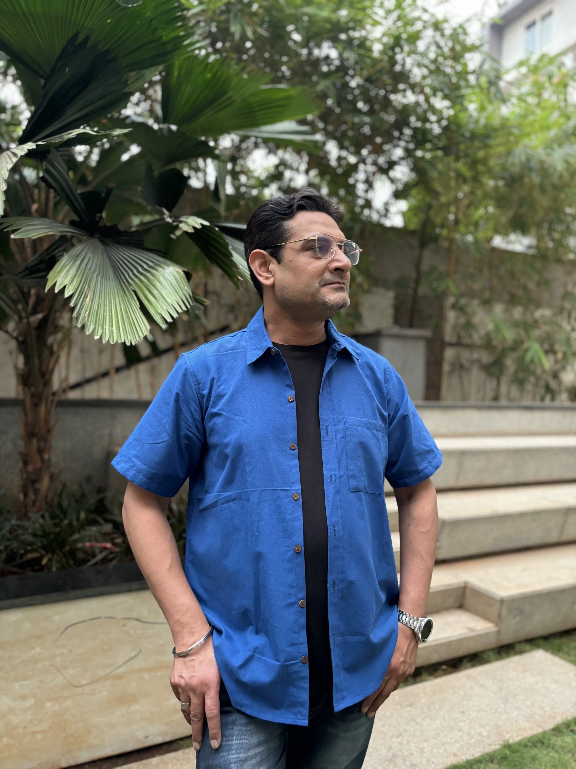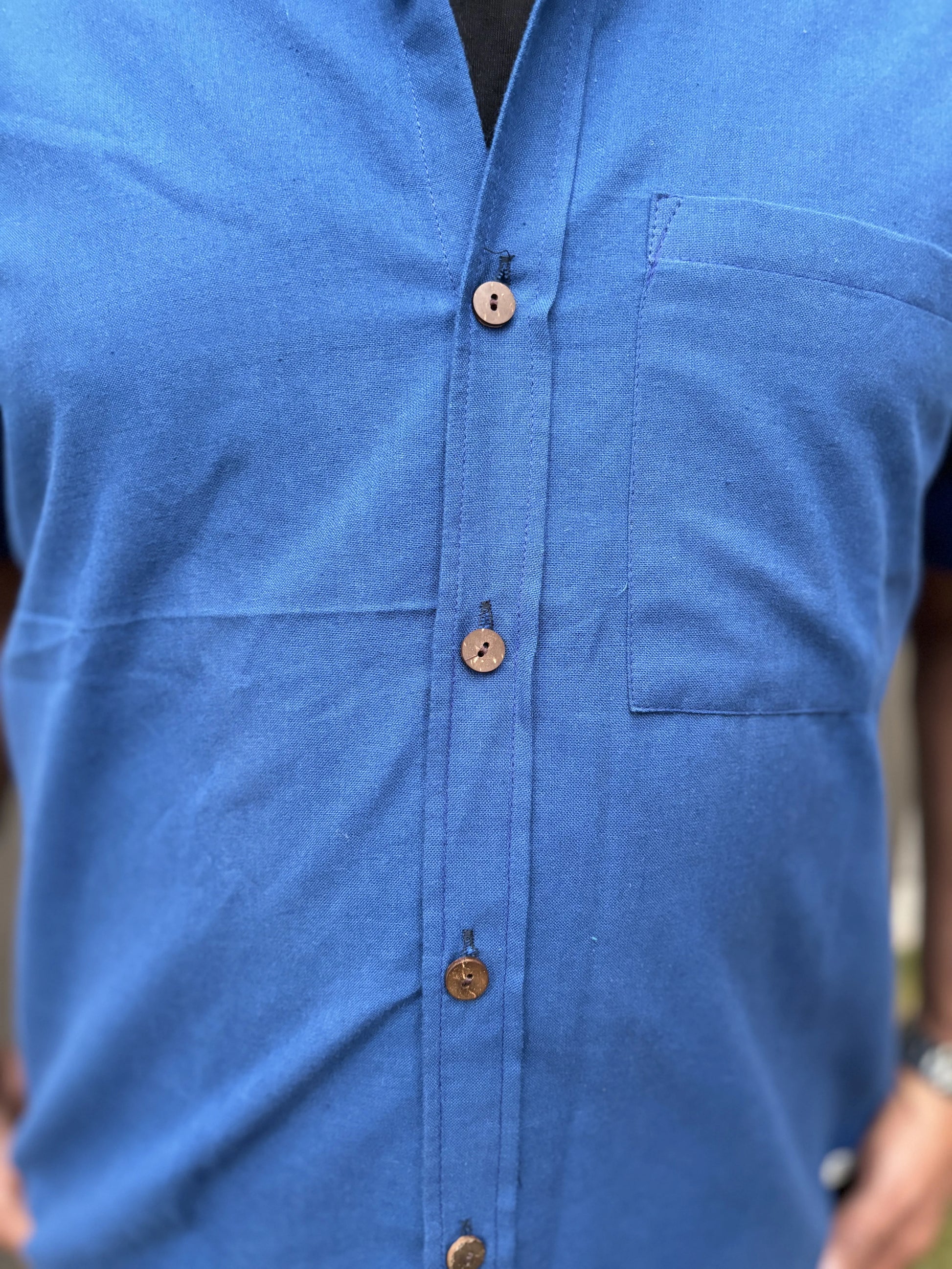Rooted in tradition and refined for today, this blue solid shirt is handwoven in the looms of Koyyalagudem. Made from breathable cotton and finished with wooden buttons and a left-side pocket, it brings quiet sophistication to everyday dressing. Style it with white or beige pants for a clean, thoughtful look.