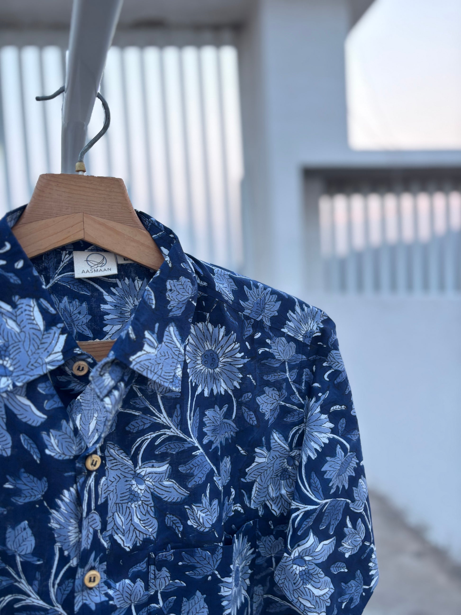A deep blue base brought to life with delicate Sanganeri florals, this shirt balances detail with ease. Hand block printed on breathable cotton, it carries the charm of traditional craft in a silhouette made for everyday wear.