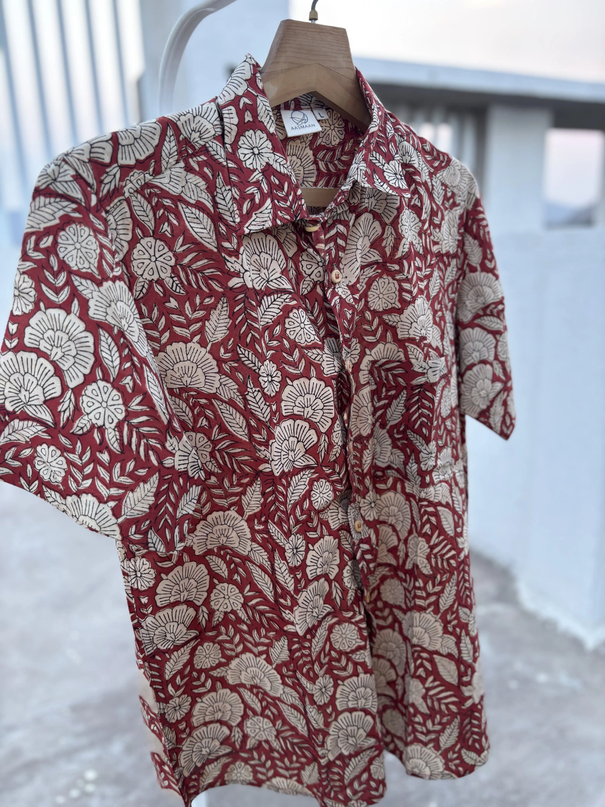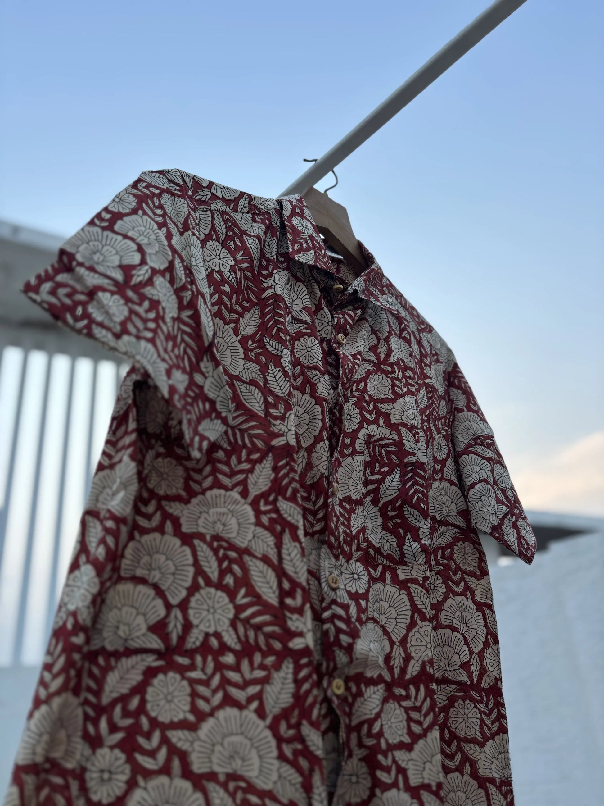 Bold, rooted, and full of character—this dark red floral shirt is hand block printed by artisans on soft, breathable cotton. Featuring a relaxed silhouette with wooden buttons and a functional left pocket, it effortlessly blends craft with comfort. Style it with beige trousers or blue jeans for a statement look.