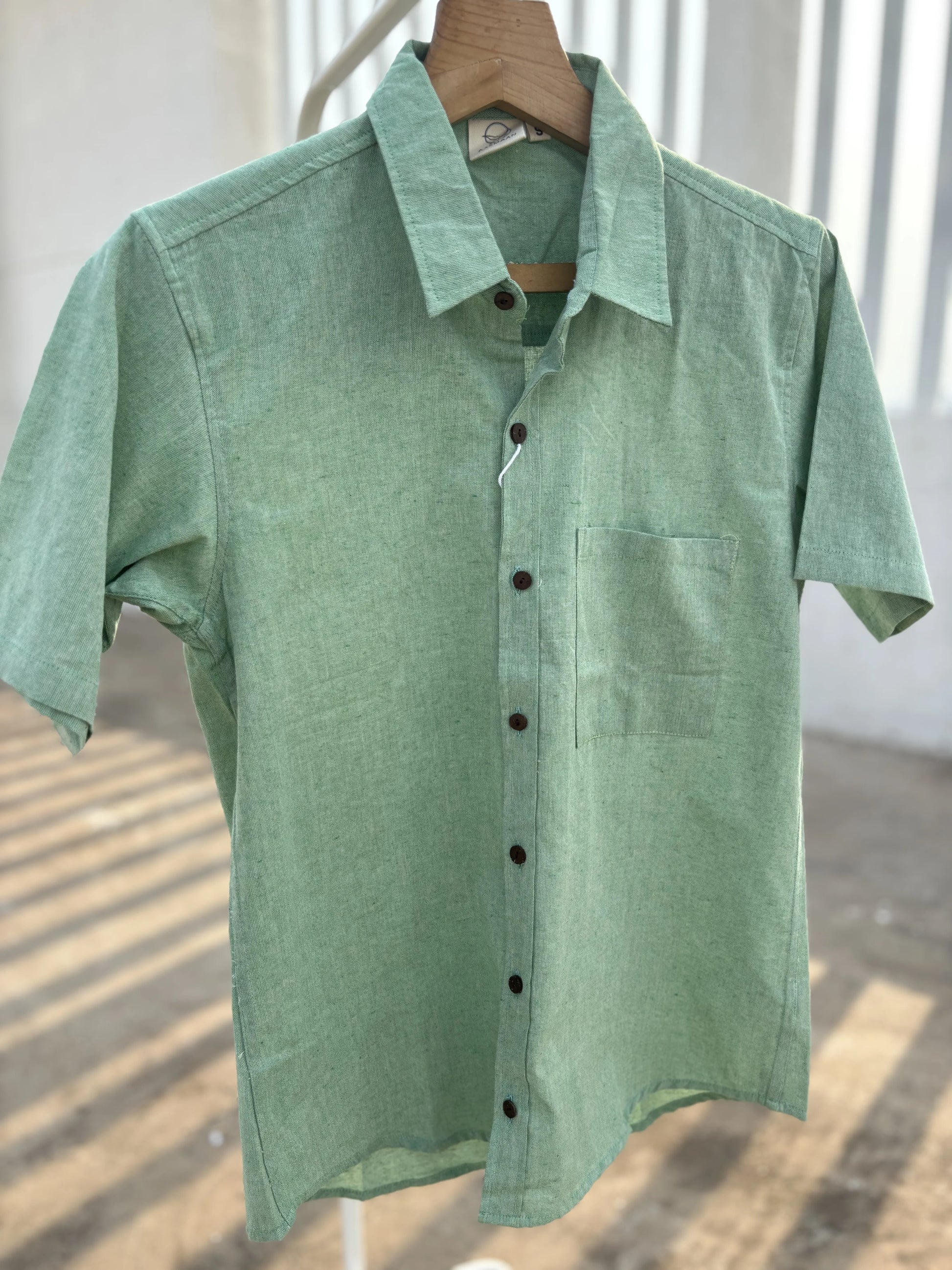 Crafted from breathable handwoven cotton, this green solid shirt blends comfort with conscious styling. Featuring coconut shell buttons and a functional left pocket, it’s designed for ease and elegance. Style it with neutrals or denim for a relaxed, earthy vibe that works from day to night.