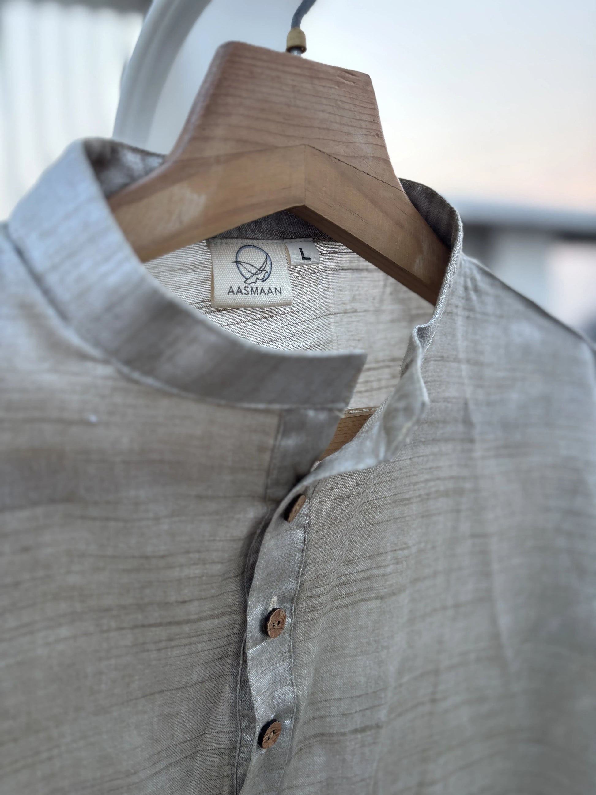 Elevate your everyday ethnicwear with Aasmaan’s light gold short kurta for men, crafted from breathable Bhagalpuri cotton. With a subtle sheen and lightweight feel, this kurta blends tradition with quiet sophistication. The natural wooden buttons add a rustic charm, making it ideal for festive get-togethers or cultural occasions.