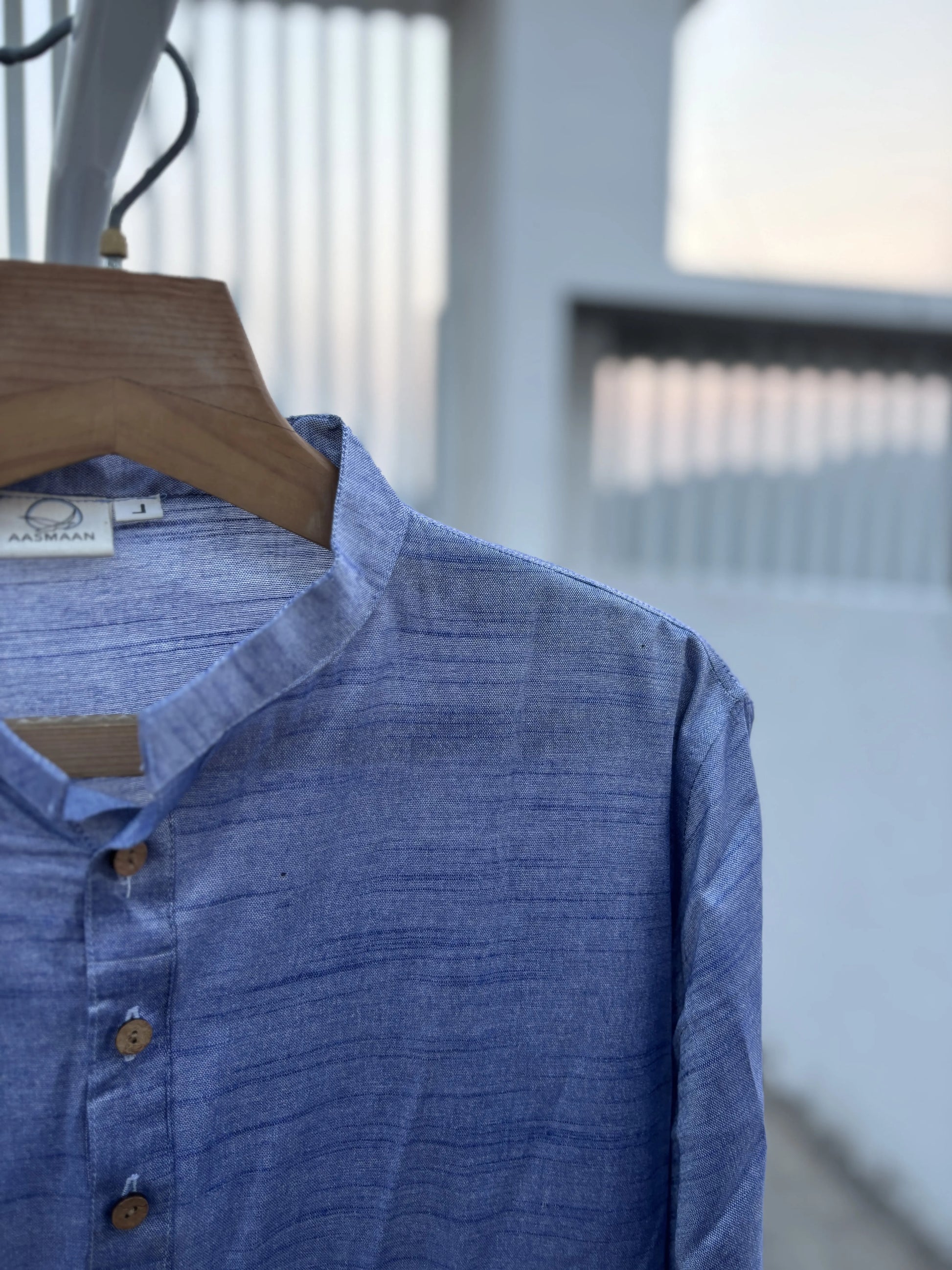 Light and refreshing, Aasmaan’s sky blue short kurta for men is tailored from breathable Bhagalpuri cotton, offering effortless style and comfort. Accented with natural wooden buttons, this kurta is a versatile wardrobe staple for both everyday wear and festive occasions.