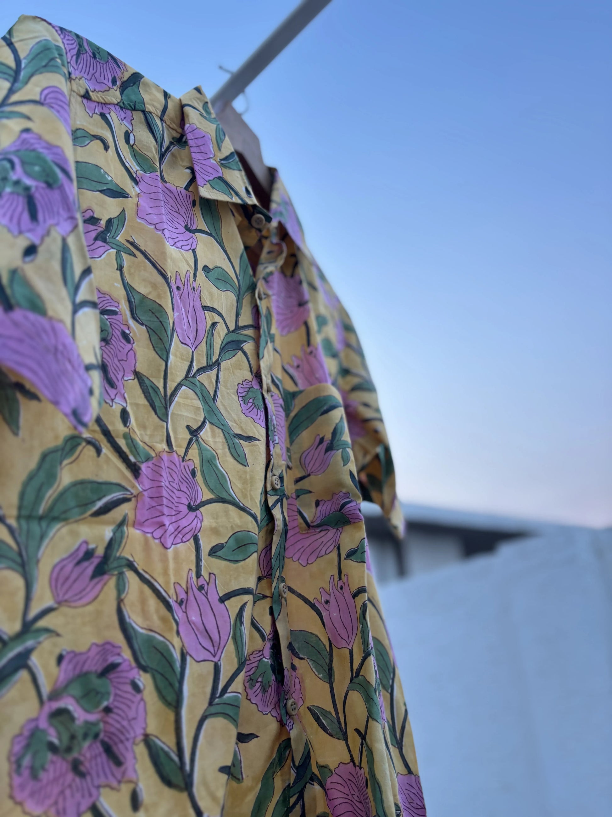 Crafted using the timeless Sanganeri block printing technique, this yellow floral shirt blends heritage with everyday comfort. Featuring bold hand-printed blooms on soft cotton, it’s finished with classic wooden buttons and a left pocket—made for the modern man who values stories woven into every thread.